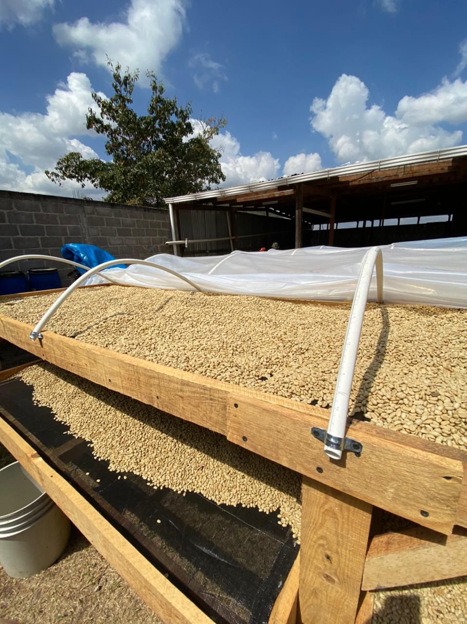 After harvesting, the cherries were placed inside barrels under covered conditions for 24–28 hours of anaerobic dry fermentation. Then the coffee was depulped and dried on raised beds under a solar dome.